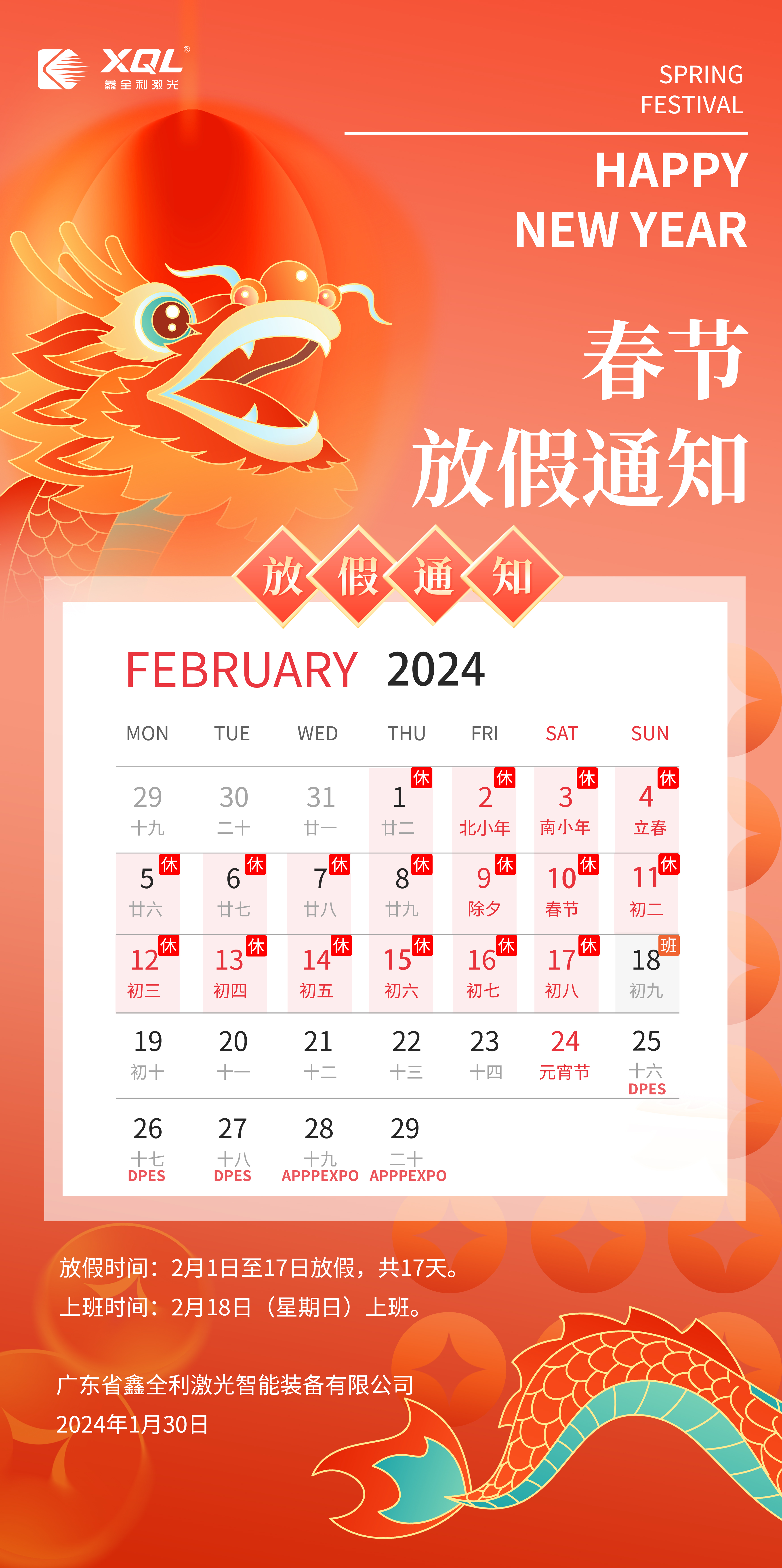 在2024年春節長假到來之際,感謝大家一如既往的支持和厚愛,在此,鑫全利激光及全體員工衷心祝愿每一位合作伙伴/客戶,在新的一年里,身體健康、生意興隆、家庭幸福!