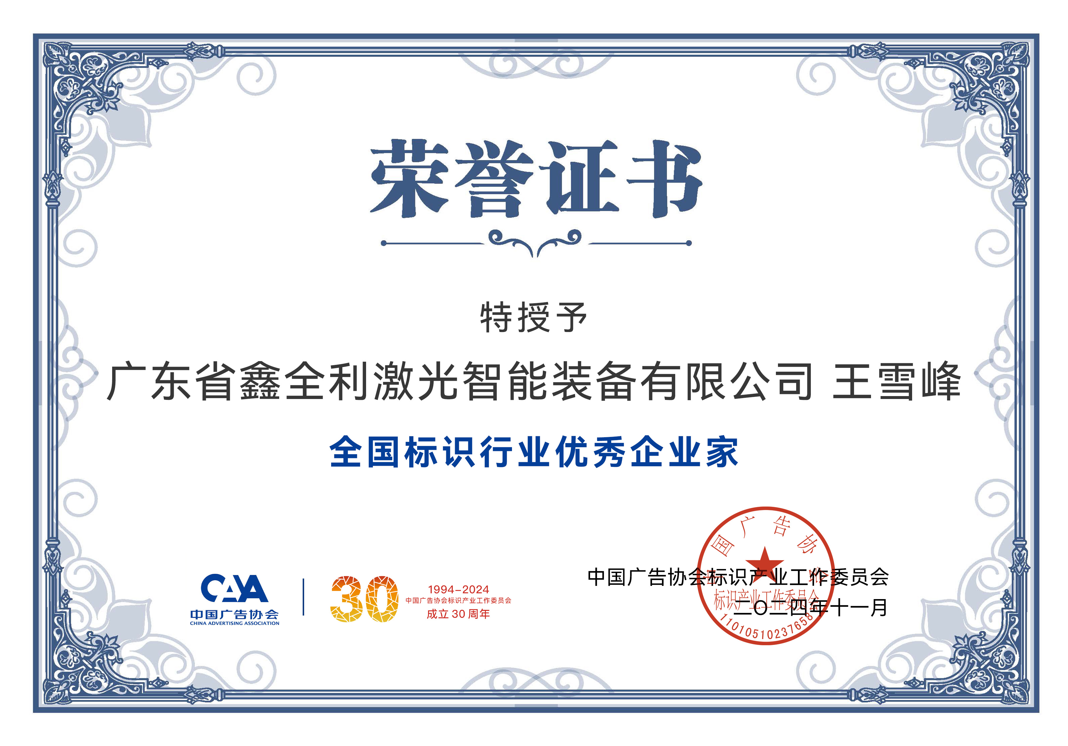 2024 年 11月 ,我司董事長(zhǎng)王雪峰先生憑借其卓越的領(lǐng)導(dǎo)才能和對(duì)廣告標(biāo)識(shí)行業(yè)發(fā)展的杰出貢獻(xiàn),被中國(guó)廣告協(xié)會(huì)標(biāo)識(shí)產(chǎn)業(yè)工作委員會(huì)授予“全國(guó)標(biāo)識(shí)行業(yè)優(yōu)秀企業(yè)家”稱號(hào),為公司的發(fā)展,書(shū)寫(xiě)新篇章。
