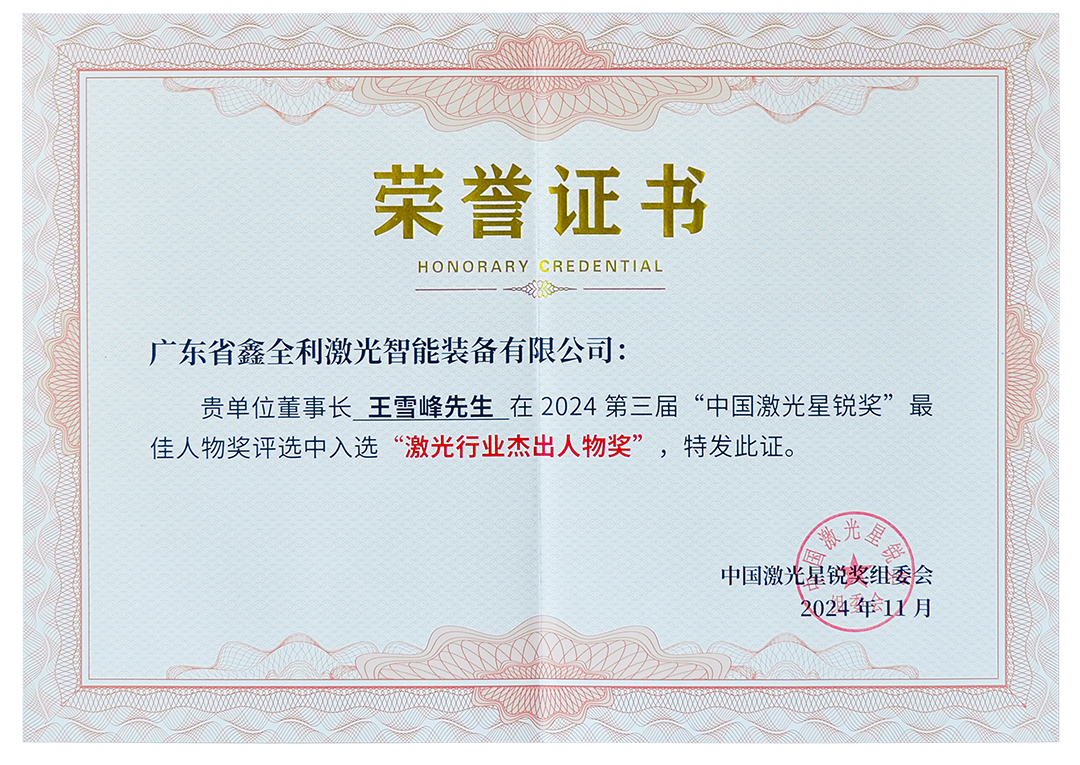 年度頒獎盛典上揭曉了諸多重要獎項。我司董事長王雪峰先生在2024 第三屆“中國激光星銳獎”的評選中,獲評“激光行業(yè)杰出人物獎”。這一殊榮是對董事長王雪峰先生以及鑫全利激光在推動激光智能裝備行業(yè)發(fā)展,提升行業(yè)整體水平的肯定。