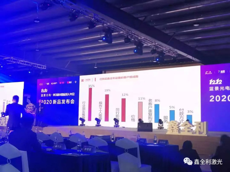鑫全利激光市場部總經理田總在年會主會場進行了一系列產品宣講,在現場為嘉賓講解了目前公司提供的高功率激光切割機的型號、功率水平、市場銷售份額與服務水平等問題。