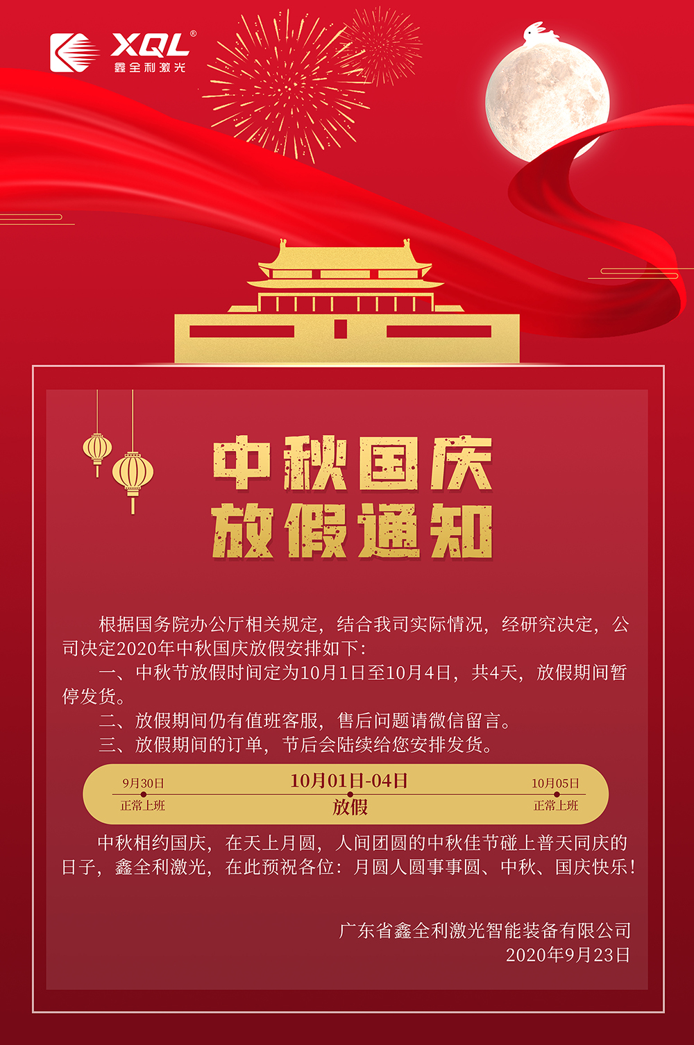 鑫全利激光國(guó)慶&中秋放假通知:自10月1日至10月4日,共4天。放假期間,我司暫停發(fā)貨,不便之處,敬請(qǐng)諒解!