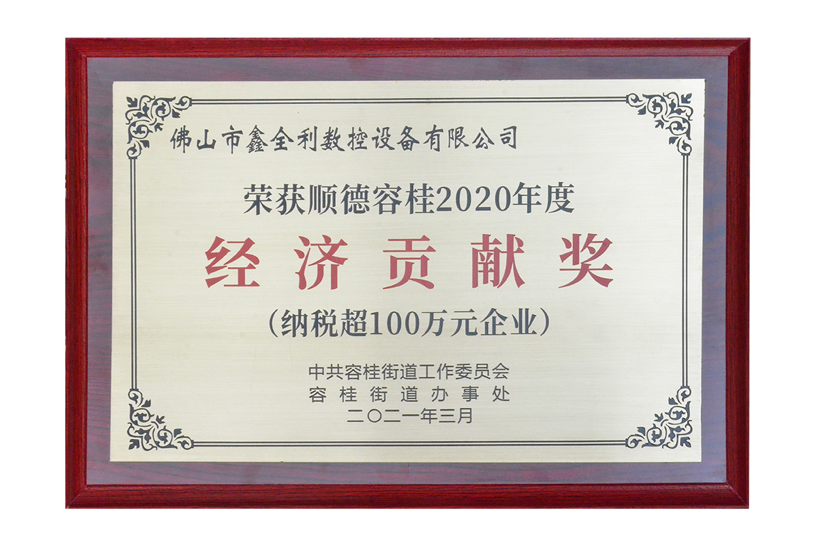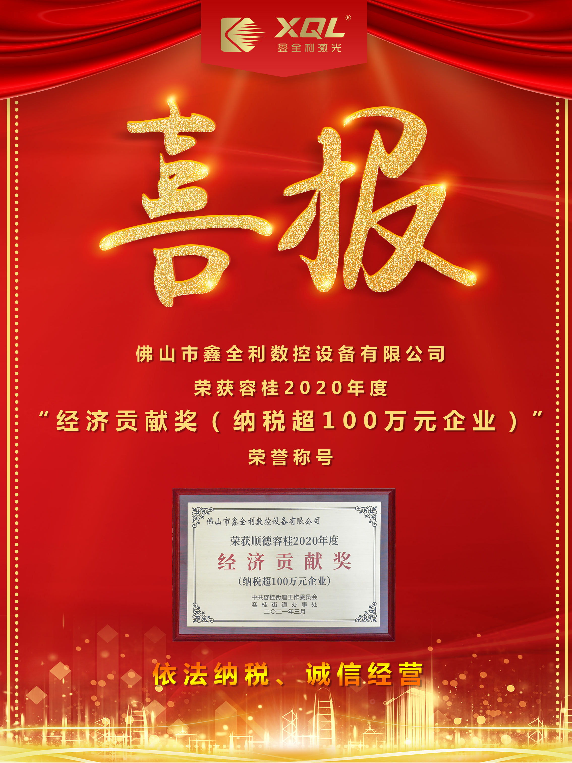 鑫全利激光榮獲容桂2020年度“經濟貢獻獎(納稅超100萬元企業)”榮譽稱號!