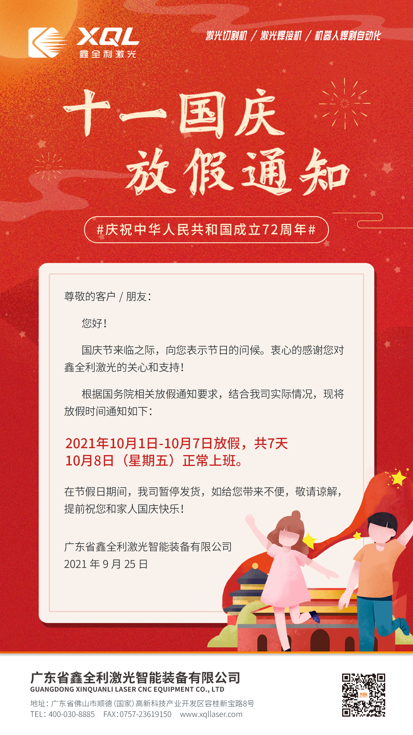 鑫全利激光國慶節放假通知