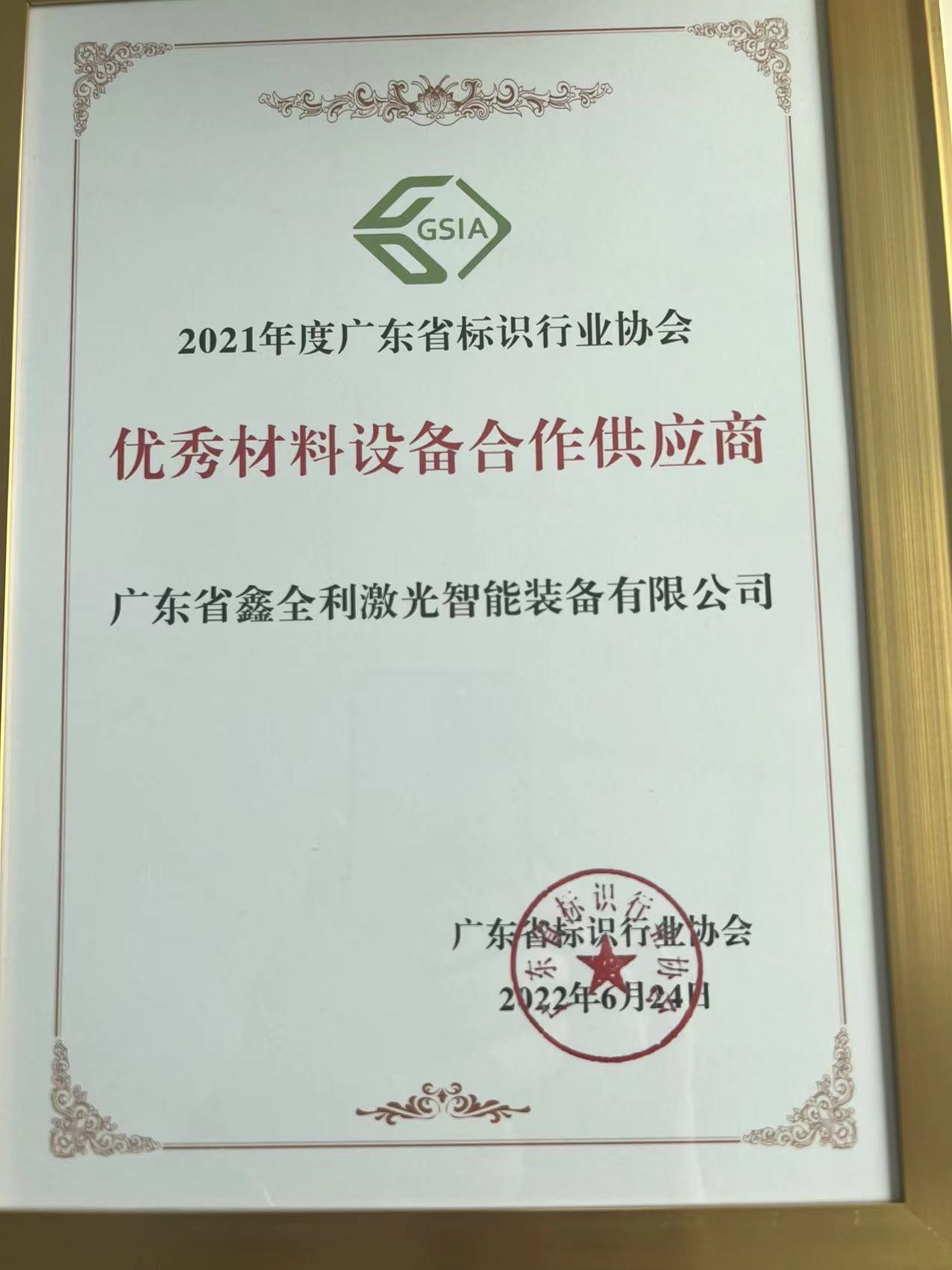 鑫全利激光榮獲“優秀合作供應商”獎牌