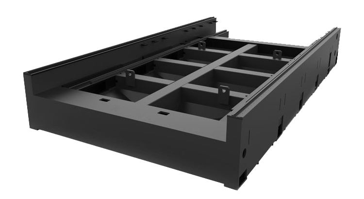 機加工時使用數控龍門銑床,一次性加工床身兩側的導軌和齒條安裝面,保證了機架兩側導軌、齒條安裝面精度的一致性。